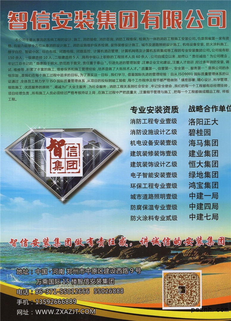 智信安裝集團有限公司 消防專業(yè)施工壹級_城市道路照明壹級_機電設(shè)備安裝壹級點擊:925 查看原圖![]() ![]() ![]() 地址:中國·河南 鄭州市中原區(qū)建設(shè)西路9號萬乘國際廣場15層智信安裝集團