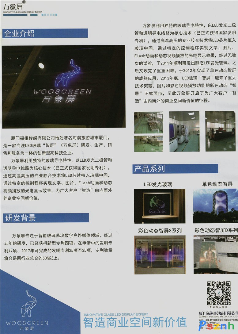 廈門福相傳媒有限公司 萬象智屏 彩色動(dòng)態(tài)智屏 單色動(dòng)態(tài)智屏 LED發(fā)光玻璃點(diǎn)擊:729 查看原圖![]() ![]() ![]() 電話: 4006022727