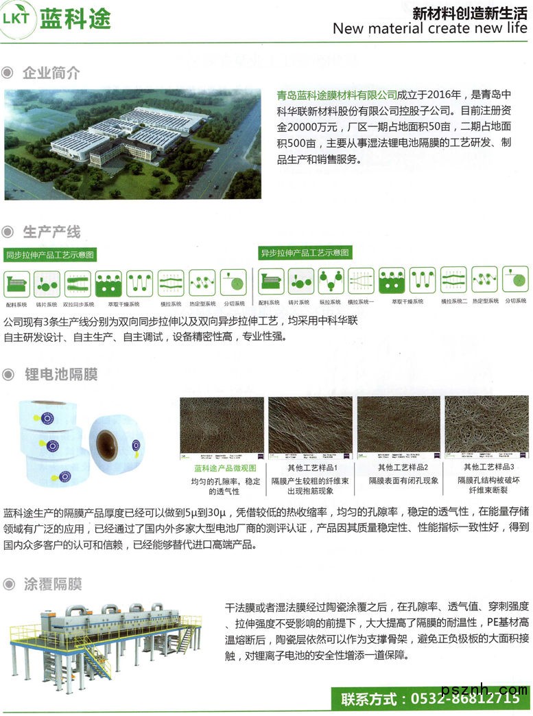 青島藍(lán)科途膜材料有限公司 濕法鋰離子電池隔膜 鋰離子電池隔膜 PE隔膜基 陶瓷涂覆隔膜 深圳電池展點(diǎn)擊:1813 查看原圖![]() ![]() ![]() 公司地址: 山東省青島市西海岸新區(qū)中德生態(tài)園