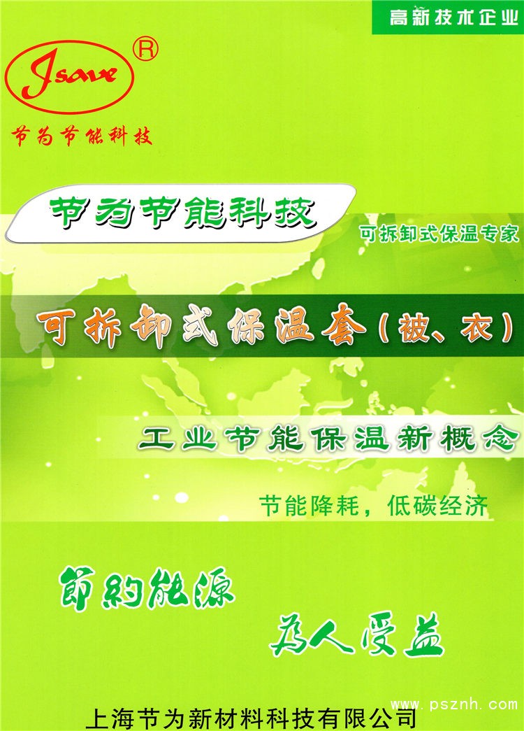 | 公司簡介: | 上海節(jié)為新材料科技有限公司是一家從事高溫絕熱產(chǎn)品生產(chǎn)研發(fā)的企業(yè),以特殊可拆卸保溫隔熱套、耐高溫隔熱板、特殊保溫絕熱項(xiàng)目工程為主,針對各類熱電、石化、機(jī)械制造、塑料工業(yè)等工廠客戶,從源頭、過程、回收等環(huán)節(jié)進(jìn)行節(jié)能工程的研發(fā)。