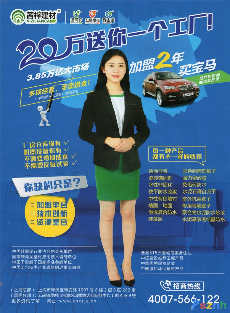 上海茜梓建材科技有限公司 _特種防水_瓷磚膠_錨固劑_硅藻泥_建筑建材_建筑涂料點(diǎn)擊:1681 查看原圖![]() ![]() ![]() 名稱:上海茜梓建材(集團(tuán))有限公司