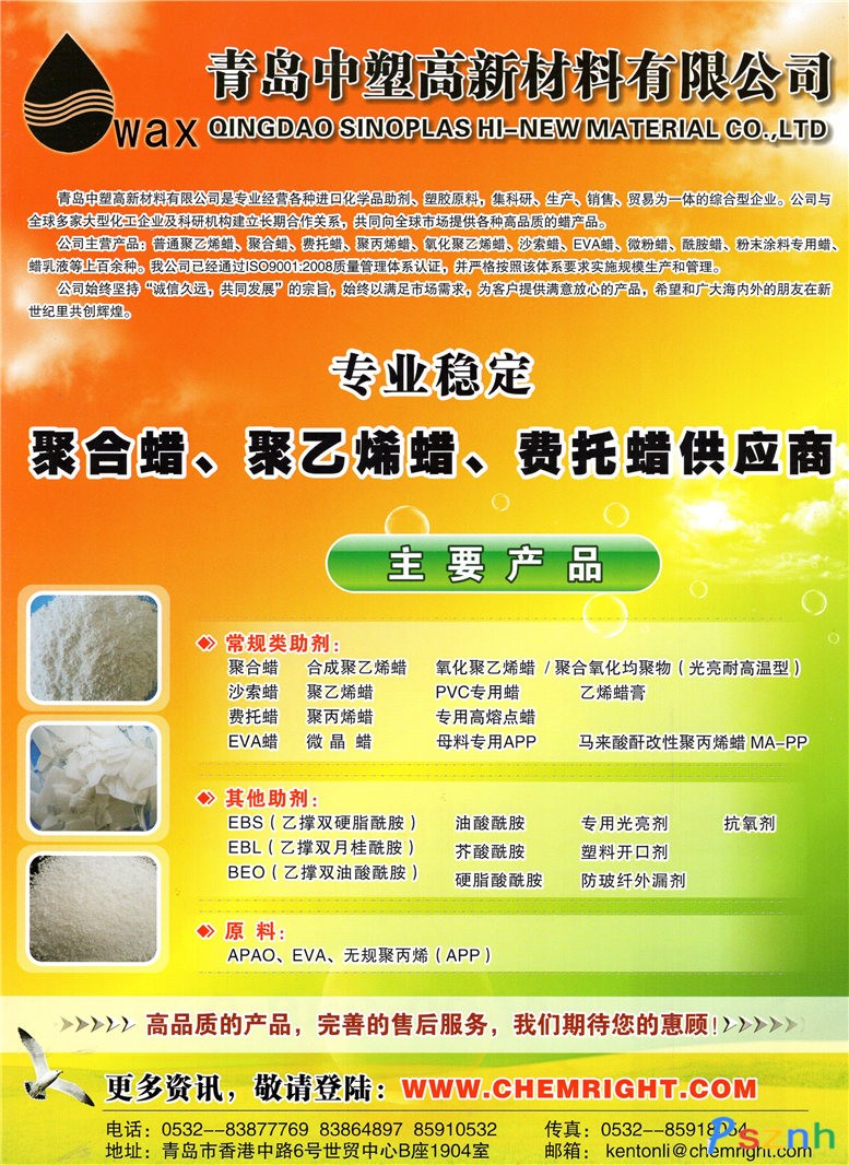 青島中塑高新材料有限公司 _聚合蠟_費(fèi)托蠟_聚丙烯蠟_化學(xué)品助劑_塑膠原料點(diǎn)擊:2459 查看原圖![]() ![]() ![]() 地 址:青島市 城陽(yáng)區(qū) 棘洪灘街道(青大工業(yè)園)