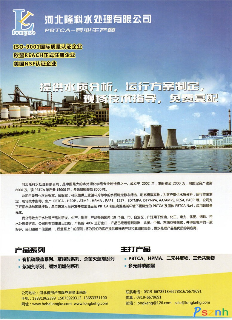 | 經(jīng)營(yíng)范圍: | 工業(yè)循環(huán)冷卻水處理、工業(yè)污水、城市生活污水處理;2-膦酸基-1,2,4-三羧基丁烷銷售及本企業(yè)相關(guān)的產(chǎn)品的出口業(yè)務(wù)(國家限定公司經(jīng)營(yíng)或出口的商品及技術(shù)除外)。(依法須經(jīng)批準(zhǔn)的項(xiàng)目,經(jīng)相關(guān)部門批準(zhǔn)后方可開展經(jīng)營(yíng)活動(dòng)) | ||