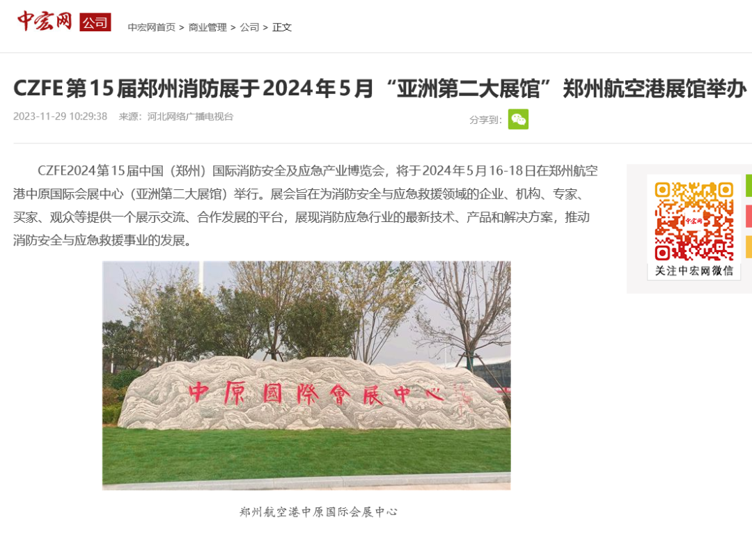 2024年5月16-18日,CZFE2024第15屆中國(鄭州)國際消防安全及應(yīng)急產(chǎn)業(yè)博覽會,將移師“亞洲第二大展館”鄭州中原國際會展中心(航空港館)隆重舉行,展覽規(guī)模20000㎡、500家展商、共設(shè)1200個(gè)展位。
