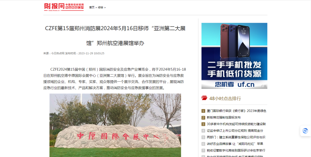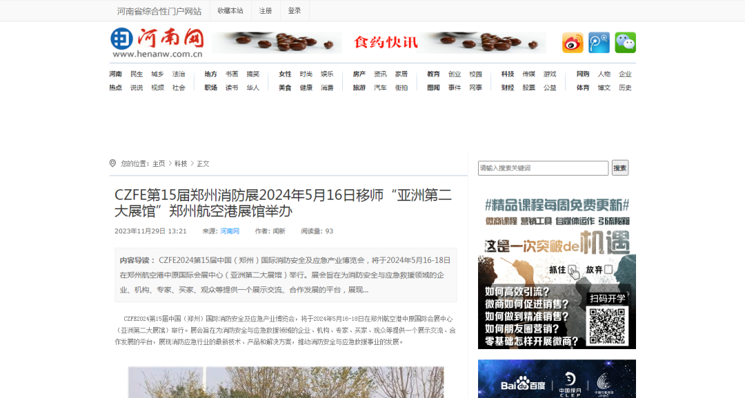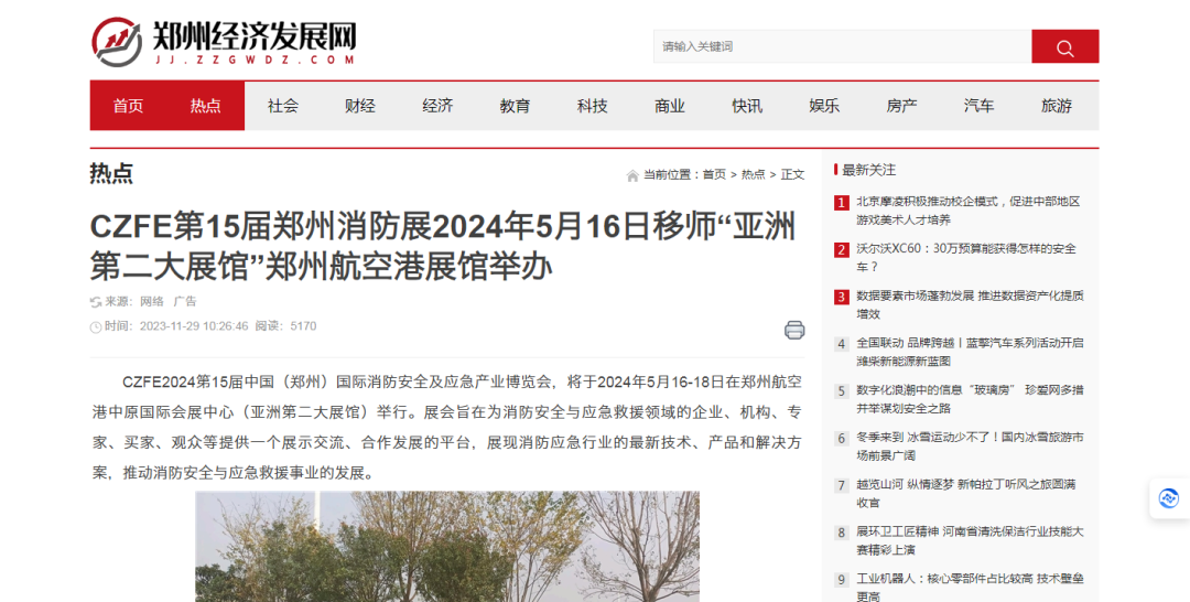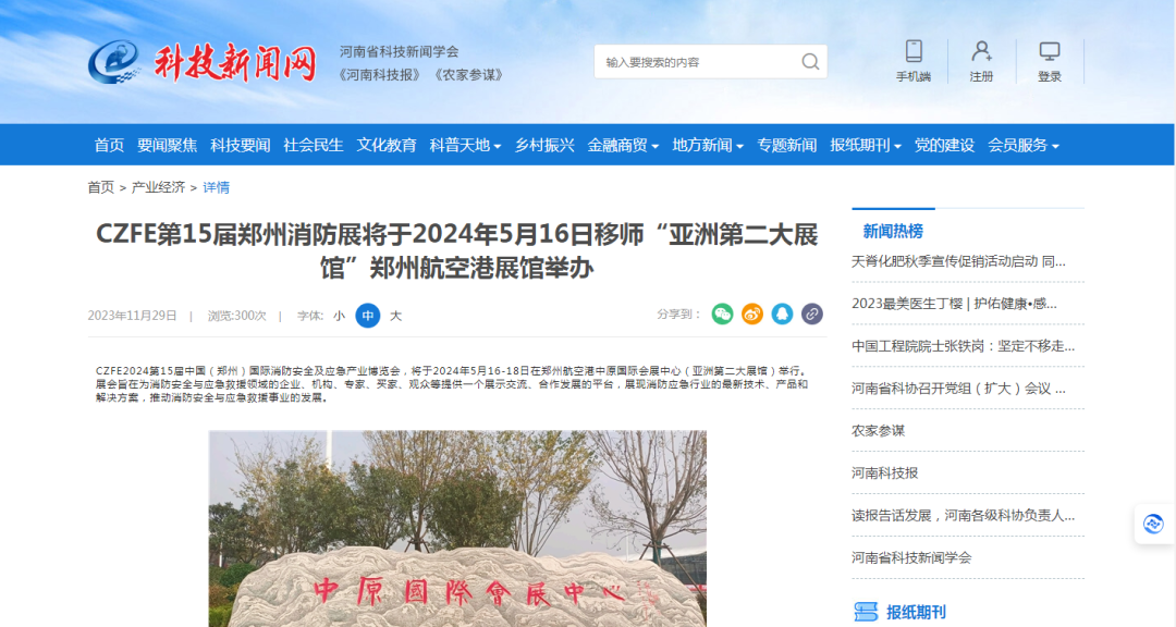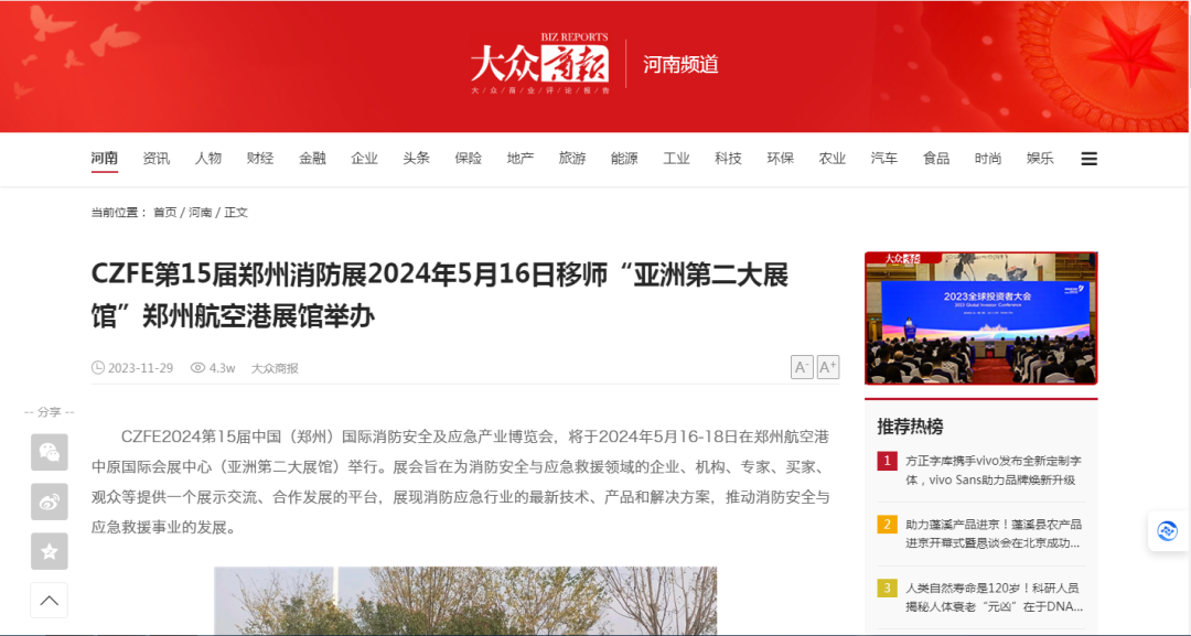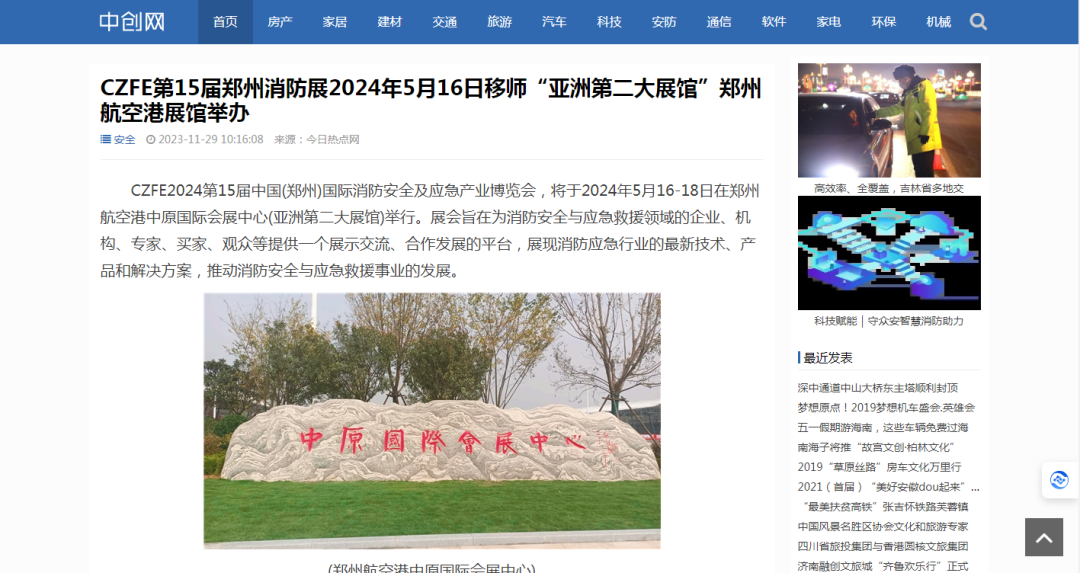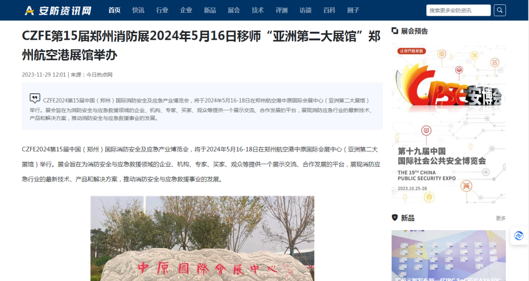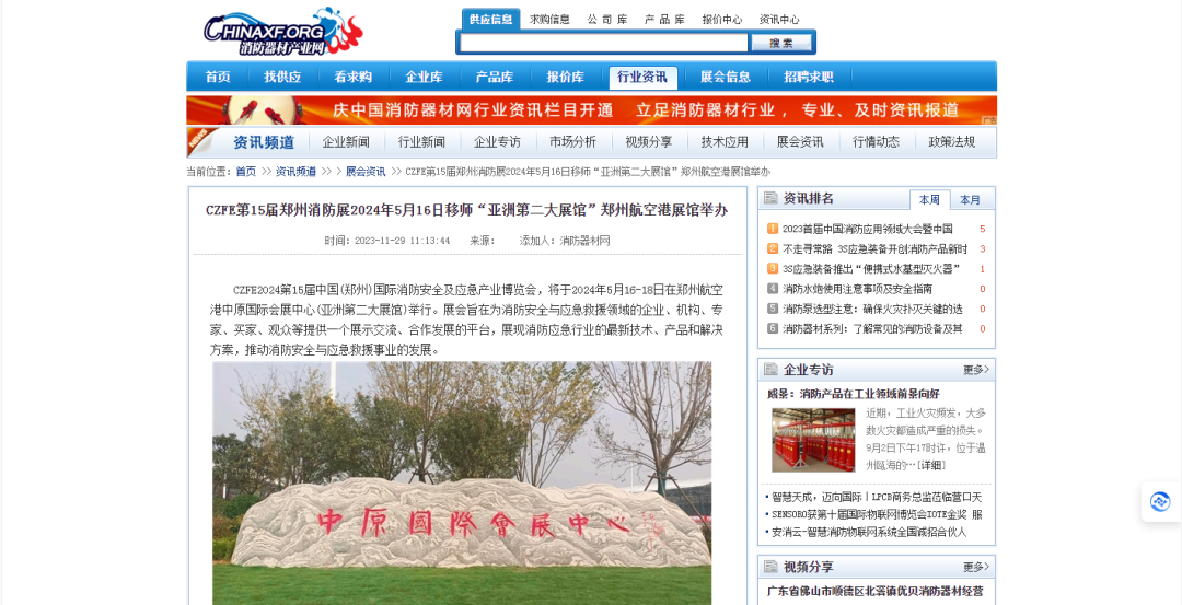CZFE2024第15屆鄭州國際消防展自啟動籌備至今,受到了媒體行業(yè)廣泛關(guān)注,其中包括中國網(wǎng)應(yīng)急、中國經(jīng)濟(jì)新聞網(wǎng)、鳳凰網(wǎng)商業(yè)、中國日報(bào)、新浪新聞、中華網(wǎng)、中國商報(bào)、中國發(fā)展網(wǎng)、中國企業(yè)報(bào)、網(wǎng)易新聞、大眾網(wǎng)、中國產(chǎn)業(yè)經(jīng)濟(jì)信息網(wǎng)、中宏網(wǎng)、環(huán)球網(wǎng)、中國經(jīng)營網(wǎng)、人民日報(bào)客戶端地方號隨機(jī)、企業(yè)觀察報(bào)、中國報(bào)道、中國財(cái)富網(wǎng)、極客網(wǎng)、頂端新聞(新堯網(wǎng))、中原新聞網(wǎng)、河南廣電網(wǎng)、鄭州新聞網(wǎng)、科技新聞網(wǎng)(河南科技報(bào))、信陽日報(bào)、商都網(wǎng)、中原傳媒網(wǎng)、中華經(jīng)濟(jì)發(fā)展網(wǎng)、《消費(fèi)界》河南、《大眾商報(bào)》河南、印象河南網(wǎng)、焦作網(wǎng)、河南網(wǎng)首發(fā)、河南日報(bào)客戶端官方(商訊)、商廣網(wǎng)、鄭州經(jīng)濟(jì)發(fā)展網(wǎng)、周口網(wǎng)、消防器材網(wǎng)(消防器材產(chǎn)業(yè)網(wǎng))、中創(chuàng)網(wǎng)安全安防、中國應(yīng)急安全網(wǎng)、中國消防網(wǎng)、中國安防網(wǎng)、安防資訊網(wǎng)、安防知識網(wǎng)、雪球網(wǎng)、今日頭條、搜狐、知乎網(wǎng)、百度、商丘新聞網(wǎng)、中國財(cái)經(jīng)時(shí)報(bào)網(wǎng)、中國焦點(diǎn)日報(bào)、時(shí)代商業(yè)網(wǎng)、愛云資訊、A5站長網(wǎng)、今報(bào)在線、中國消費(fèi)新聞網(wǎng)等近百余家媒體網(wǎng)站的爭相報(bào)道。