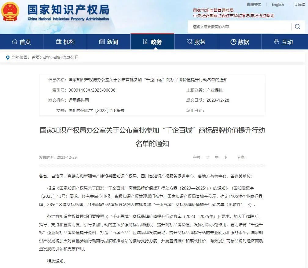 為加快推進知識產(chǎn)權(quán)強國建設(shè),深入實施商標(biāo)品牌戰(zhàn)略,促進企業(yè)和區(qū)域商標(biāo)品牌價值提升,助力經(jīng)濟高質(zhì)量發(fā)展,2023年4月,國家知識產(chǎn)權(quán)局開展“千企百城”商標(biāo)品牌價值提升行動。對入選單位,各地方知識產(chǎn)權(quán)管理部門將通過加大工作聯(lián)系、指導(dǎo)、支持和宣傳力度,引導(dǎo)入選單位加強商標(biāo)品牌建設(shè),提升商標(biāo)品牌價值,發(fā)揮引領(lǐng)示范作用,著力培育“千企千標(biāo)”企業(yè)商標(biāo)品牌價值提升范例,國家知識產(chǎn)權(quán)局將加大指導(dǎo)支持力度,開展宣傳推廣和成效評價,有效發(fā)揮商標(biāo)品牌對經(jīng)濟高質(zhì)量發(fā)展的引領(lǐng)和支撐作用。