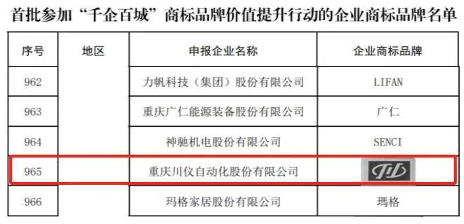 近日,國家知識產(chǎn)權(quán)局發(fā)布《關(guān)于公布首批參加“千企百城”商標(biāo)品牌價值提升行動名單的通知》,重慶川儀自動化股份有限公司(以下簡稱“川儀股份”或“公司”)所持川儀商標(biāo)成功入選并通過公示,被確定為首批參加“千企百城”商標(biāo)品牌價值提升行動的企業(yè)商標(biāo)品牌。