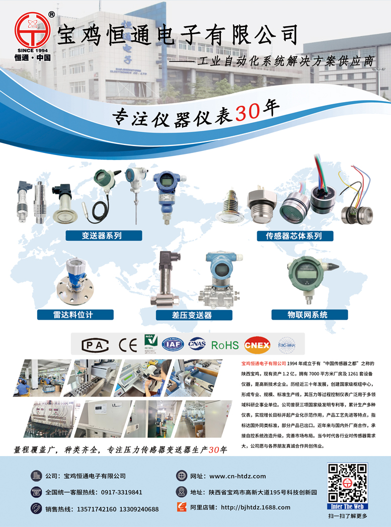 寶雞恒通電子有限公司位于“中國(guó)傳感器之都”陜西省寶雞市,成立于1994年,現(xiàn)有資產(chǎn)1.2億,擁有廠房7000平方米,設(shè)備儀器1261套,是集科研、生產(chǎn)與銷售服務(wù)為一體的高新技術(shù)企業(yè)。經(jīng)過近三十年的創(chuàng)新發(fā)展,恒通電子創(chuàng)建了國(guó)家級(jí)壓力傳感器產(chǎn)業(yè)化樞紐中心,形成了專業(yè)化、規(guī)模化、標(biāo)準(zhǔn)化的生產(chǎn)線。公司生產(chǎn)的壓力、溫度、液位、流量等過程控制儀器儀表,廣泛應(yīng)用于航空航天、水運(yùn)航海、石油化工、水利水文、電力、煤炭冶金、供水、供氣、供熱、醫(yī)學(xué)生物工程等領(lǐng)域的計(jì)量、控制、監(jiān)測(cè)系統(tǒng)中。