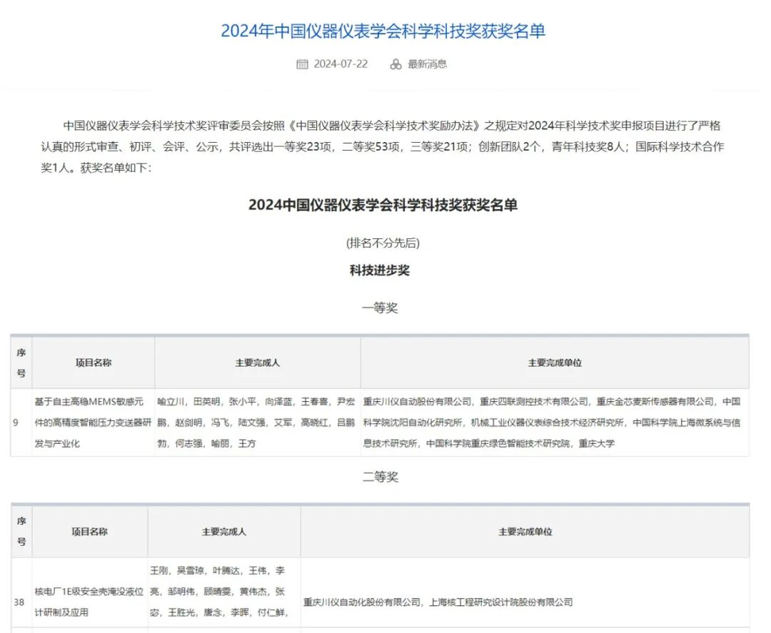 日前,中國儀器儀表學(xué)會(huì)公布2024年中國儀器儀表學(xué)會(huì)科學(xué)技術(shù)獎(jiǎng)獲獎(jiǎng)名單,川儀股份牽頭的“基于自主高穩(wěn)MEMS敏感元件的高精度智能壓力變送器研發(fā)與產(chǎn)業(yè)化”項(xiàng)目榮獲科技進(jìn)步一等獎(jiǎng),“核電廠1E級(jí)安全殼淹沒液位計(jì)研制及應(yīng)用”項(xiàng)目榮獲科技進(jìn)步二等獎(jiǎng)。