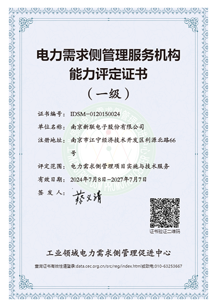 近日,南京新聯(lián)電子股份有限公司順利通過(guò)工業(yè)領(lǐng)域電力需求側(cè)管理促進(jìn)中心能力評(píng)估審核,公司電力需求側(cè)管理服務(wù)機(jī)構(gòu)能力評(píng)定證書(shū)(一級(jí))成功換證,這是對(duì)新聯(lián)電子在電力需求側(cè)領(lǐng)域服務(wù)能力和技術(shù)實(shí)力的充分肯定。