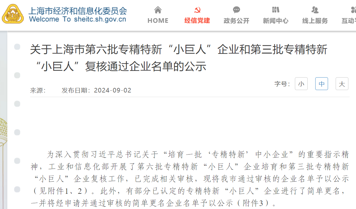 近日,國家工業(yè)和信息化部開展了第六批專精特新“小巨人”企業(yè)培育和第三批專精特新“小巨人”企業(yè)復核工作,上??咸赜?021年榮獲國家專精特新“小巨人”企業(yè)榮譽稱號,三年來憑借卓越的創(chuàng)新實力和穩(wěn)健的發(fā)展態(tài)勢,成功通過復核并予以公示。