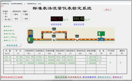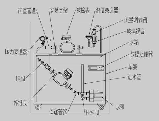 該裝置基于流體連續(xù)流原理,以標(biāo)準(zhǔn)表(如渦輪流量計、渦街流量計、電磁流量計、容積式流量計、科里奧利質(zhì)量流量計等)為主標(biāo)準(zhǔn)器,在相同時間間隔內(nèi)流體連續(xù)通過標(biāo)準(zhǔn)表和被檢流量計,通過比較兩者的輸出流量值,確定被檢流量計的計量性能。根據(jù)液體不可壓縮的原理,在同一管道中任何時刻不同截面處的流量均相等,通過精確測量標(biāo)準(zhǔn)表與被檢表的脈沖信號計數(shù)及標(biāo)準(zhǔn)表的儀表系數(shù),利用特定公式計算得出被檢表的儀表系數(shù),從而實現(xiàn)對被檢流量計的標(biāo)定。