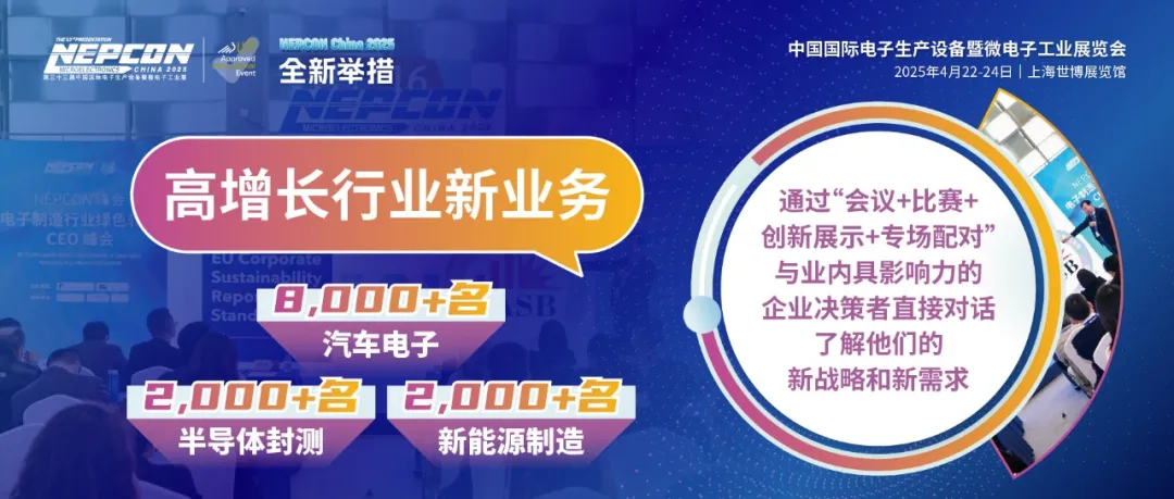 NEPCON China 2025力求為三大高增長行業(yè)搭建起內(nèi)外溝通與合作的橋梁,通過采取展示+會議+競賽+專場對接這一綜合化的運作模式,開展汽車電子、半導(dǎo)體封測、新能源制造三大主題活動,屆時將吸引8,000名汽車電子行業(yè)、2,000名半導(dǎo)體封測行業(yè)以及2,000名新能源制造行業(yè)的專業(yè)觀眾,為行業(yè)精英呈現(xiàn)新標(biāo)準、新技術(shù)、新趨勢,深入洞察其新戰(zhàn)略導(dǎo)向與市場需求。