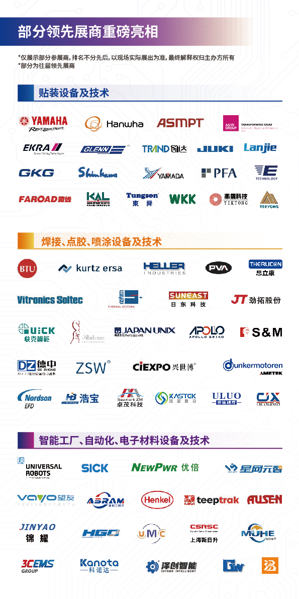 眾多海內(nèi)外展商云集:貼裝+焊接、點(diǎn)膠、噴涂+智能工廠、自動(dòng)化、電子材料+測(cè)試測(cè)量+半導(dǎo)體封測(cè)+貼裝配套