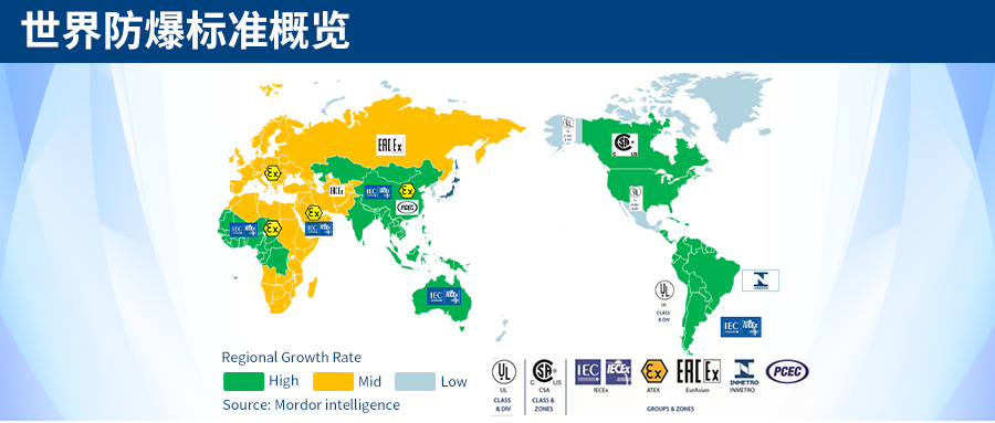 面對(duì)日益嚴(yán)峻的安全形勢(shì),“防爆”已從技術(shù)規(guī)范上升為剛性法律法規(guī)。各國(guó)基于工業(yè)特點(diǎn)建立了相應(yīng)體系,如歐盟ATEX、國(guó)際IECEx、美國(guó)UL標(biāo)準(zhǔn)及中國(guó)GB 3836系列等,均對(duì)危險(xiǎn)區(qū)域設(shè)備的設(shè)計(jì)、制造與使用提出嚴(yán)格規(guī)定。 在全球能源轉(zhuǎn)型與安全標(biāo)準(zhǔn)提升的推動(dòng)下,高效可靠的防爆技術(shù)需求持續(xù)增長(zhǎng)。市場(chǎng)研究顯示,2020至2025年全球防爆設(shè)備年復(fù)合增長(zhǎng)率預(yù)計(jì)達(dá)5%-7%,部分細(xì)分領(lǐng)域甚至超過10%。預(yù)計(jì)到2028年,該市場(chǎng)年復(fù)合增長(zhǎng)率將達(dá)25.87%,規(guī)模突破100億美元。