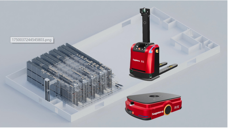 同時,4臺 AGV 也已同步部署運行,包括2臺潛伏式用于線邊配送、2臺叉車式用于大件搬運。系統(tǒng)采用SLAM激光導航技術(shù),具備自主路徑規(guī)劃與智能避障能力,可實現(xiàn)7×24小時連續(xù)作業(yè)。