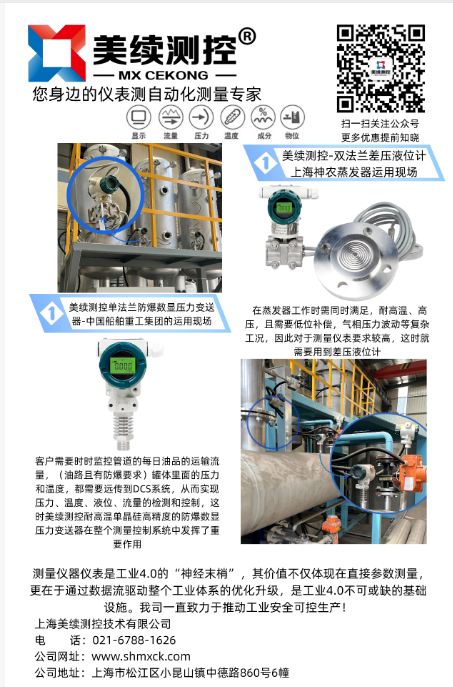 上海美續(xù)測(cè)控憑借在工業(yè)測(cè)控技術(shù)領(lǐng)域近十年的深耕,攜自主研發(fā)的壓力變送器、溫度傳感器、流量計(jì)、差壓變送器等全系列高精度儀器儀表重磅登場(chǎng)。這些專為蒸發(fā)結(jié)晶工藝復(fù)雜工況設(shè)計(jì)的核心產(chǎn)品,具備耐高溫、抗腐蝕、長(zhǎng)期穩(wěn)定性強(qiáng)的特點(diǎn),能夠?qū)崟r(shí)監(jiān)測(cè)蒸發(fā)器內(nèi)壓力波動(dòng)、溫度梯度、流體流量及差壓變化,為工藝優(yōu)化提供精準(zhǔn)數(shù)據(jù)支撐,顯著提升生產(chǎn)效率與資源利用率