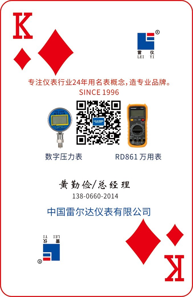 《2020圖頁儀表行業(yè)撲克牌》推出就得到雷爾達(dá)儀表有限公司黃勤儉總經(jīng)理的認(rèn)同和支持,黃總雷爾達(dá)儀表積極認(rèn)領(lǐng)了方塊K做為此次的公司的專屬牌!