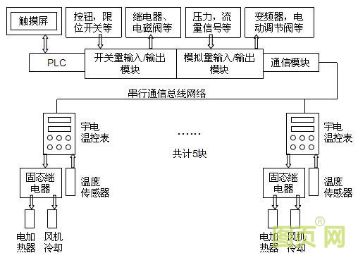 2.2實施方案以及應用分析:根據(jù)客戶的要求,為客戶選定的宇電儀表型號是AI-526EGL1S(V8.28),這個儀表型號具有的儀表功能如下,0.25級精度,雙PID,加熱制冷雙輸出,支持雙通訊協(xié)議?;诖藘x表功能,為客戶設計了PLC配合儀表使用的方案,具體過程如下:系統(tǒng)啟動時,進入加熱狀態(tài),溫度傳感器(熱電偶或者熱電阻)檢測到溫度模擬量信號后發(fā)送給儀表,儀表讀取溫度,測量到的實測值與溫度設定值進行比較得到偏差,根據(jù)AI-526內(nèi)置的AI人工智能PID調(diào)節(jié)算法,求得相應的控制量去控制固態(tài)繼電器,從而調(diào)節(jié)電加熱器的加熱功率。當溫度達到設定值時停止加熱,此時,PLC通過485通訊的方式獲得信號,并利用該信號來控制系統(tǒng)的運行狀態(tài)。由于螺桿旋轉的剪切會產(chǎn)生摩擦產(chǎn)生的多余熱量,為了避免溫度過高使塑料分解、焦燒或定型困難,當溫度過高時,AI-526溫控器的制冷功能起作用,制冷端輸出信號控制風冷系統(tǒng)啟動,使溫度下降到設定值。通過加熱制冷雙輸出的配合控制,形成對于溫度模擬量的閉環(huán)測量和控制,達到客戶預想要的溫度。整個系統(tǒng)中例如開關量的邏輯控制、順序控制和壓力、流量等其他模擬量信號的采集則交給PLC來完成。