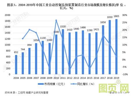 2019 年工業(yè)自動化行業(yè)整體需求較為疲軟,由于中美貿(mào)易爭端帶來的不確定性,全年制造業(yè)固定資產(chǎn)投資增速維持在2-3%的低位。19 年OEM 和項目型市場需求的分化,在單產(chǎn)品的市場規(guī)模上也有所反映,19 年國內(nèi)低壓變頻器市場規(guī)模為203 億元,同比微增0.43%,而伺服和PLC 產(chǎn)品的市場規(guī)模分別為110/113 億元,同比分別下滑5.6%/2%??傮w而言工業(yè)自動化市場規(guī)模已經(jīng)從2004年的652億元增長至2018年的1830億元,年復(fù)合增長率達(dá)到7.65%;2019年我國自動化及工業(yè)控制市場規(guī)模達(dá)到1865億元,規(guī)模增速繼續(xù)下滑。