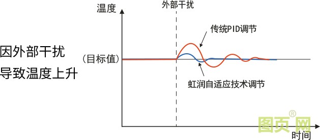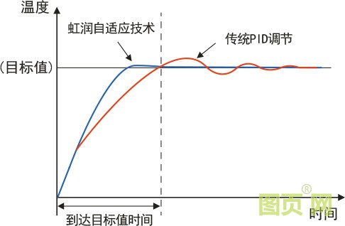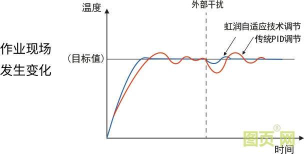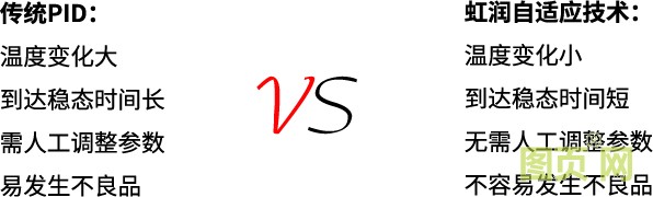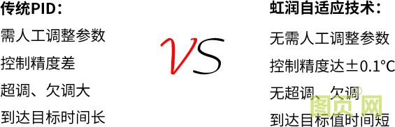 虹潤自適應(yīng)控制技術(shù)可自動(dòng)整定出較佳PID值。監(jiān)視裝備的溫度控制狀態(tài),自動(dòng)調(diào)節(jié)PID值,對(duì)工件變化及裝備變化、環(huán)境變化等進(jìn)行較佳溫度控制。