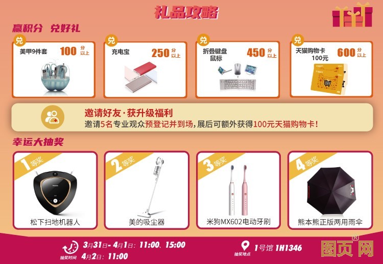 為了答謝小伙伴們一直以來的支持,記錄廣東泵閥展一路以來的成長,主辦方為大家準(zhǔn)備了驚喜大禮,凡到場觀眾可憑積分兌換禮品,100積分可兌換美甲九件套,250積分可兌換充電寶,450積分可兌換折疊鍵盤或鼠標(biāo),600積分可兌換100元天貓購物卡!此外,現(xiàn)場還有一波幸運(yùn)大抽獎,不為別的,只為觀眾福利到位,家用必備松下掃地機(jī)器人、美的吸塵器,口腔健康米狗MX602電動牙刷等,更好神秘好禮,等你今天來解鎖!通通免費(fèi)送哦~