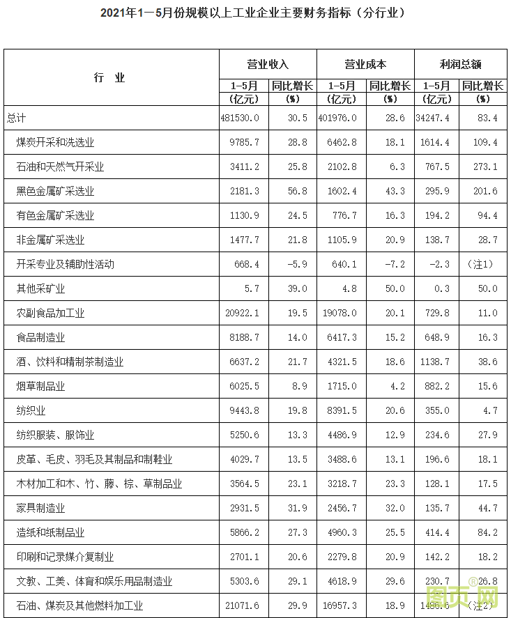 1-5月份,在41個工業(yè)大類行業(yè)中,39個行業(yè)利潤總額同比增加,1個行業(yè)扭虧為盈,1個行業(yè)實現(xiàn)減虧。主要行業(yè)利潤情況如下:有色金屬冶煉和壓延加工業(yè)利潤總額同比增長3.87倍,黑色金屬冶煉和壓延加工業(yè)增長3.77倍, 石油和天然氣開采業(yè)增長2.73倍,化學原料和化學制品制造業(yè)增長2.11倍,煤炭開采和洗選業(yè)增長1.09倍,汽車制造業(yè)增長81.1%,電氣機械和器材制造業(yè)增長49.8%,計算機、通信和其他電子設備制造業(yè)增長49.3%,通用設備制造業(yè)增長45.5%,專用設備制造業(yè)增長38.4%,非金屬礦物制品業(yè)增長30.3%,電力、熱力生產(chǎn)和供應業(yè)增長24.7%,農(nóng)副食品加工業(yè)增長11.0%,紡織業(yè)增長4.7%,石油、煤炭及其他燃料加工業(yè)由同期虧損轉為盈利。