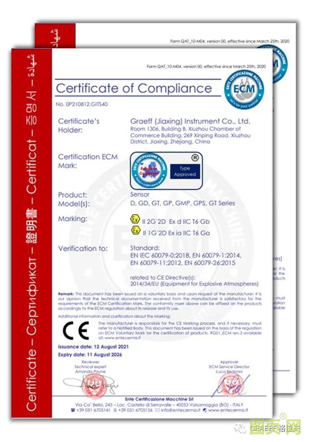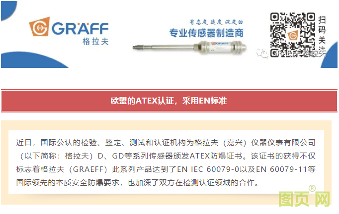 近日,國(guó)際公認(rèn)的檢驗(yàn)、鑒定、測(cè)試和認(rèn)證機(jī)構(gòu)為格拉夫(嘉興)儀器儀表有限公司(以下簡(jiǎn)稱(chēng):格拉夫)D、GD等系列傳感器頒發(fā)ATEX防爆證書(shū)。