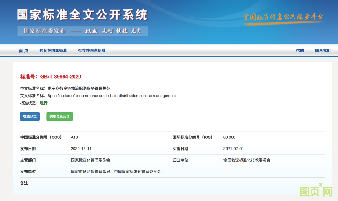 7月1日,由國(guó)家市場(chǎng)監(jiān)督管理總局、國(guó)家標(biāo)準(zhǔn)化管理委員會(huì)正式發(fā)布,由全國(guó)物流標(biāo)準(zhǔn)化技術(shù)委員會(huì)提出并歸口的《電子商務(wù)冷鏈物流配送服務(wù)管理規(guī)范》(GB/T 39664-2020)國(guó)家標(biāo)準(zhǔn)正式實(shí)施。