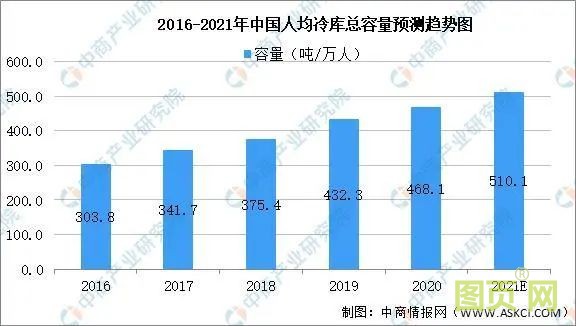 判斷一個(gè)地區(qū)冷庫(kù)水平高低,除了絕對(duì)總量,人均冷庫(kù)容量也是衡量冷鏈發(fā)展程度的重要指標(biāo)。數(shù)據(jù)顯示,2016年至2019年期間,我國(guó)人均冷庫(kù)容量由303.75噸/萬(wàn)人上升至432.31噸/萬(wàn)人。中商產(chǎn)業(yè)研究院預(yù)測(cè),2021年我國(guó)人均冷庫(kù)容量可達(dá)510.1噸/萬(wàn)人。