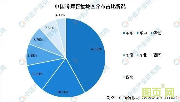 受經(jīng)濟(jì)發(fā)展的地域性特點(diǎn)影響,我國(guó)冷庫(kù)在華東地區(qū)最為集中,2019年,華東冷庫(kù)容量占到了全國(guó)總?cè)萘康?2.03%;其次是華中、華北和華南地區(qū),其冷庫(kù)容量占全國(guó)總?cè)萘康谋壤謩e為18.24%、11.61%和8.88%;西南、西北和東北地區(qū)冷庫(kù)容量較少,占比均低于10%,分別為7.31%、4.17%和7.76%。