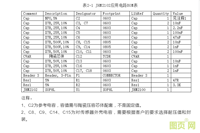 JHM2102是一款針對陶瓷電容傳感器設(shè)計的信號調(diào)理電路。它所適用的陶瓷電容傳感器一般具有可變電容CVAR和參考電容CREF兩個電容,其中CVAR隨外部壓力的變化而變化,而CREF電容基本不隨壓力變化而變化。JHM2102充分利用這兩個電容的特點,測量兩者的比值,并經(jīng)過一系列的信號調(diào)理產(chǎn)生出與壓力變化成比例的電壓信號輸出。