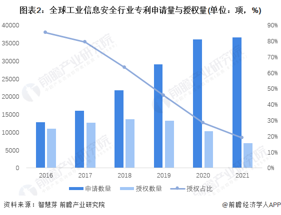 截至2022年6月23日,全球工業(yè)信息安全行業(yè)專利年授權(quán)數(shù)量為6923項,授權(quán)比重為18.97%,較2020年末進(jìn)一步下降。