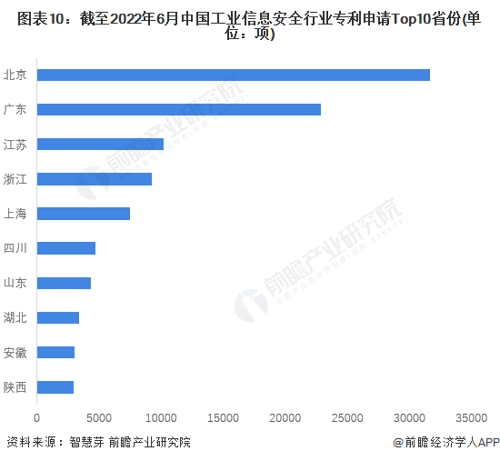 從我國工業(yè)信息安全行業(yè)專利申請數(shù)量的省份分布來看,北京省工業(yè)信息安全相關(guān)專利的申請數(shù)量最多,截至2022年6月23日,共計申請31676項;其次是廣東省,共計申請22867項。