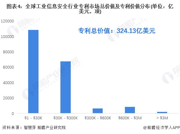 目前,從全球工業(yè)信息安全行業(yè)專利市場價值分布來看,大部分工業(yè)信息安全專利的市場價值在1-3萬美元之間,在其余價值區(qū)間的專利數(shù)量為84594項,占專利總量的43.88%。