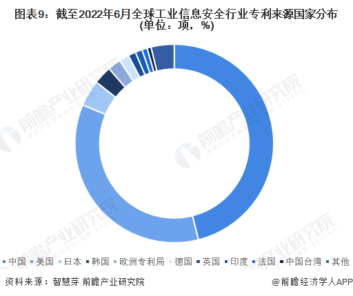 目前,全球工業(yè)信息安全行業(yè)第一大技術(shù)來源國是中國,截止2022年6月23日,中國工業(yè)信息安全相關(guān)專利數(shù)量為145373項,占全球工業(yè)信息安全專利數(shù)量的46.09%。