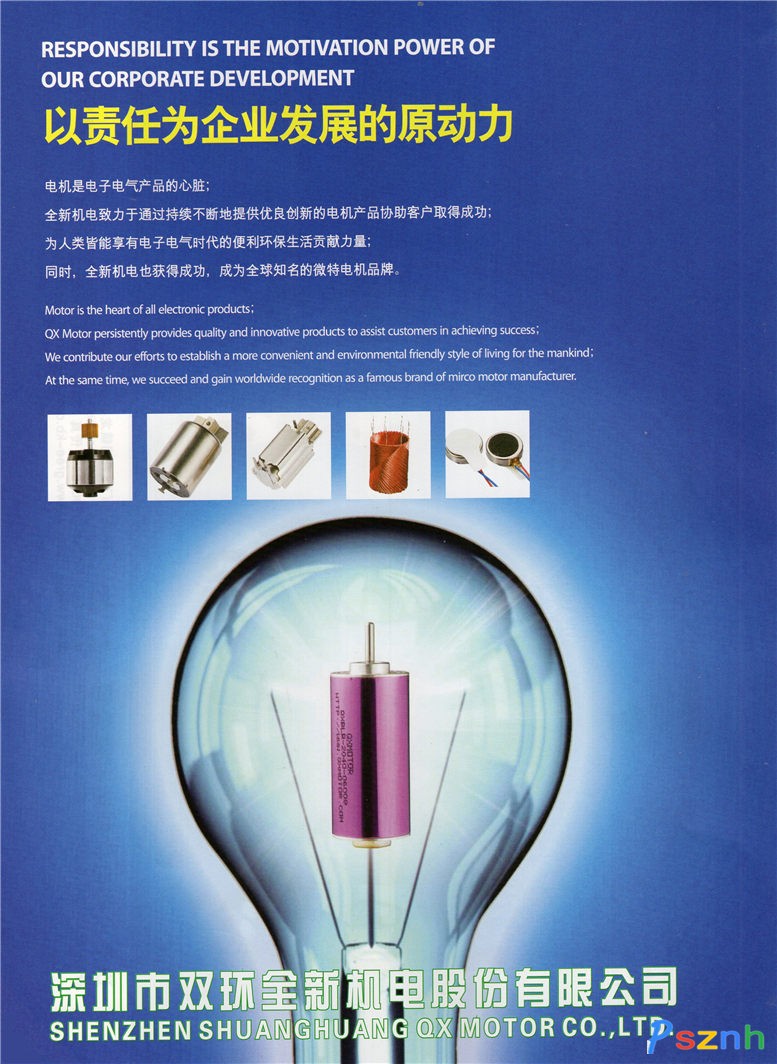 深圳市雙環(huán)全新機(jī)電股份有限公司是一個(gè)全球范圍內(nèi)的高精密電機(jī)產(chǎn)品的專業(yè)制造商,18年以來,不斷致力于速度、創(chuàng)新、品質(zhì)、成本、規(guī)模的經(jīng)營理念,使得全新機(jī)電飛速發(fā)展,成為客戶信賴的合作伙伴。 深圳市雙環(huán)全新機(jī)電股份有限公司是一家準(zhǔn)備上市的國家高新技術(shù)企業(yè),總部位于中國深圳,員工超過4000人,在深圳、湖南設(shè)有二大生產(chǎn)基地,總面積超過5萬平方米,具有1億臺的年生產(chǎn)能力。全新機(jī)電將10億計(jì)的電機(jī)產(chǎn)品提供至全球各地,并被使用在移動電話、玩具、電動工具、精密儀器、機(jī)器人、柜員機(jī)、軍工產(chǎn)品等近百種不同的應(yīng)用之上。公司主要產(chǎn)品為空心杯電機(jī)、鐵芯電機(jī)、無刷電機(jī)、振動電機(jī)。我們依賴先進(jìn)的生產(chǎn)設(shè)備及精密的檢驗(yàn)實(shí)驗(yàn)設(shè)備,輔以客戶為中心的銷售服務(wù)體系,使高速、高品質(zhì)、低成本、規(guī)?;貪M足客戶要求成為可能,協(xié)助客戶取得成功。 深圳市雙環(huán)全新機(jī)電股份有限公司以責(zé)任為企業(yè)發(fā)展的原動力。對產(chǎn)品、對客戶、對員工、對股東、對供應(yīng)商、對環(huán)境、對社會的責(zé)任,促使我們不斷奮發(fā),追求理想?,F(xiàn)在各類工程技術(shù)人員占管理人員總數(shù)的60%以上,每年研究、開發(fā)、技改費(fèi)用占銷售額的7%左右,正因如此,空心杯電機(jī)從Ф10mm到Ф4mm,從17mm長到10mm長的每一次向更短、更小方向發(fā)展的趨勢都和國外著名廠家同步。 正是堅(jiān)持不懈的采用新技術(shù)、新工藝,我們的綜合性價(jià)比在國內(nèi)同行中領(lǐng)先,1998年公司通過英國AOQC ISO9001質(zhì)量體系認(rèn)證,又使我們“產(chǎn)品質(zhì)量是我們的追求、客戶滿意是我們承諾”有了切實(shí)保障,從而使公司從成立以來銷售額每年保持50%以上的增長,產(chǎn)品進(jìn)入了國內(nèi)外手機(jī)生產(chǎn)廠。 深圳市雙環(huán)全新機(jī)電股份有限公司的產(chǎn)品能滿足各種領(lǐng)域的應(yīng)用要求。我們有足夠的電機(jī)設(shè)計(jì)及應(yīng)用的專業(yè)能力和豐富經(jīng)驗(yàn)。我們想客戶之所想,理解客戶對產(chǎn)品性能、成本、可靠性、批量生產(chǎn)、包裝、運(yùn)輸、環(huán)境等方面的所有要求。在這種理解的基礎(chǔ)上,我們與客戶的設(shè)計(jì)團(tuán)隊(duì)協(xié)力合作設(shè)計(jì)出完美的電機(jī)解決方案。 深圳市雙環(huán)全新機(jī)電股份有限公司投入了大量的時(shí)間和資源建設(shè)專業(yè)研究團(tuán)隊(duì),建設(shè)先進(jìn)的實(shí)驗(yàn)室,建立高于業(yè)界標(biāo)準(zhǔn)的嚴(yán)格的開發(fā)和測試流程,應(yīng)用現(xiàn)代的計(jì)算機(jī)輔助設(shè)計(jì)工具(CAD)和產(chǎn)品數(shù)據(jù)管理工具(PDM),這使得我們開發(fā)產(chǎn)品的速度、可靠性、應(yīng)用性、成本合理性得到根本保證。同時(shí),我們始終致力于改進(jìn)相關(guān)的技能、技術(shù)、流程和設(shè)備,深圳市雙環(huán)全新機(jī)電股份有限公司因此而保持領(lǐng)先。