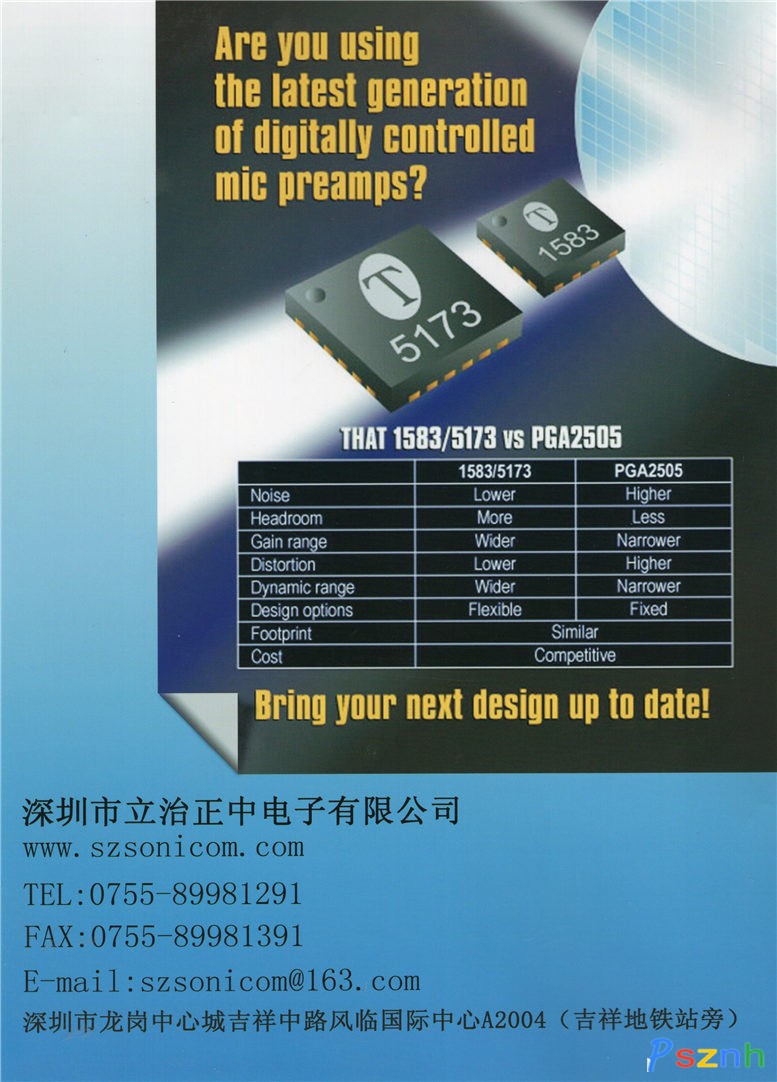 一、THAT源于著名的音響品牌dbx團(tuán)隊(duì),是美國(guó)著名的專業(yè)音頻集成電路制造商,始創(chuàng)于1989年,專著于模擬音頻小信號(hào)電路的研究,THAT的研究人員對(duì)音頻有獨(dú)特的理解和研究,他們質(zhì)疑人類聽覺最高頻率20KHz之上的音效資訊無(wú)用論的說(shuō)法,并發(fā)表一系列研究,說(shuō)明這些超音頻的重要性,他們認(rèn)為,只有將更多、更高頻率的音頻信號(hào)還原,才能正確體現(xiàn)原聲,故其產(chǎn)品帶寬一般都在2MHZ以上,部分甚至達(dá)到了20MHZ,THAT獨(dú)創(chuàng)的壓縮/解壓縮技術(shù)在模擬音效上的噪聲消除、失真改善、 增加頻率響應(yīng)等有顯著改善。 THAT最著名的產(chǎn)品是VCA(電壓控制放大器),其獨(dú)特的音頻壓縮、解壓縮技術(shù)可實(shí)現(xiàn)音頻的無(wú)損低失真壓縮,使音頻錄音的動(dòng)態(tài)擴(kuò)展,噪音改善得到及大的提升,VCA也應(yīng)用于各類音頻前級(jí),可有效改善高峰值音頻的失真,保護(hù)后級(jí)設(shè)備。 2004年,THAT Corp發(fā)表適用于高級(jí)無(wú)線麥克風(fēng)的Analog Engine IC THAT4320產(chǎn)品,應(yīng)用于音頻無(wú)線傳輸?shù)膲嚎s、擴(kuò)展,抑噪,其動(dòng)態(tài)范圍、噪音及失真指標(biāo)目前暫無(wú)其他公司產(chǎn)品能超越。 THAT公司于2009年前后推出的THAT1570+THAT5171音頻前置放大器組合,將模擬音頻與數(shù)字電路完美結(jié)合,可實(shí)現(xiàn)話音放大增益的數(shù)字步進(jìn)式控制,可方便聯(lián)網(wǎng)控制音頻設(shè)備的開關(guān)和增益控制,其噪音指標(biāo)達(dá)1 nV/√Hz input noise (60 dB gain),失真指標(biāo)達(dá) 0.0003%。