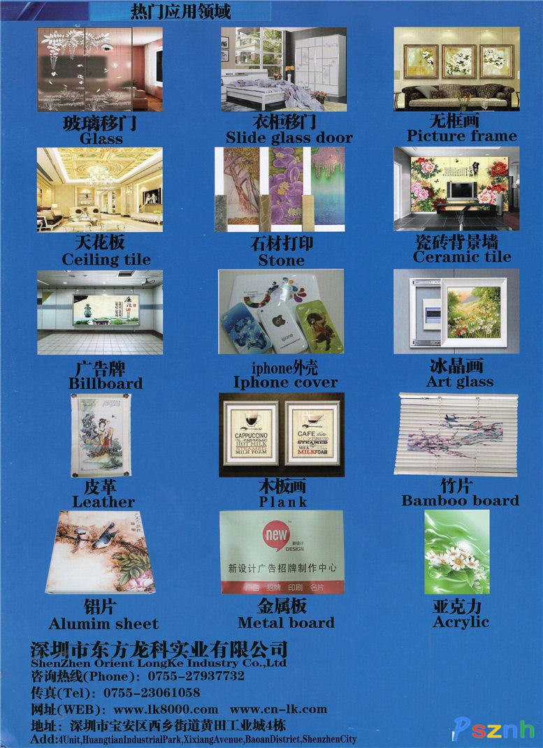 深圳東方龍科公司目前已取得多項(xiàng)國(guó)家認(rèn)證的知識(shí)產(chǎn)權(quán)和專業(yè)認(rèn)證,及8個(gè)單機(jī)的歐盟出口CE認(rèn)證。公司依托國(guó)際著名教授專家組的先進(jìn)設(shè)計(jì) 理念和技術(shù)支持,結(jié)合多年的專業(yè)制造經(jīng)驗(yàn),自主研發(fā)、設(shè)計(jì)、組裝為一體;并利用先進(jìn)技術(shù),使整個(gè)生產(chǎn)流程簡(jiǎn)單、準(zhǔn)確、安全、迅速,該生產(chǎn)流程已達(dá)到國(guó)際的 先進(jìn)水平,目前,我公司的萬(wàn)能打印機(jī)、uv平板打印機(jī)、萬(wàn)能平板打印機(jī)產(chǎn)品遍及大江南北,遠(yuǎn)銷國(guó)外市場(chǎng),觸及到各個(gè)行業(yè)領(lǐng)域,良好的性能與周到的服務(wù)均獲得客 戶一致好評(píng),百事可樂(lè)、海爾、聯(lián)想、IBM、格蘭仕、格力、等國(guó)內(nèi)外著名企業(yè)已成為東方龍科的戰(zhàn)略合作伙伴,并不斷延伸。