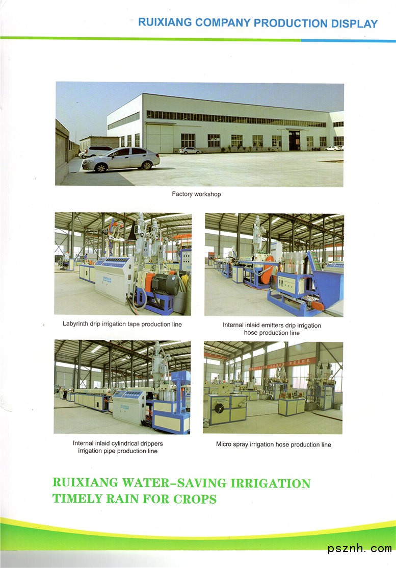 通過(guò)引進(jìn)國(guó)外的先進(jìn)技術(shù)和自主研發(fā)創(chuàng)新,公司主要的節(jié)水灌溉設(shè)備有:?jiǎn)坞p層單翼迷宮式滴灌帶生產(chǎn)線、內(nèi)鑲貼片式滴灌帶生產(chǎn)線、內(nèi)鑲圓柱式滴灌管生產(chǎn)線、微噴帶/PE水帶(軟帶)生產(chǎn)線、PE/PVC塑料管材生產(chǎn)線。節(jié)水灌溉生產(chǎn)設(shè)備更是出口到俄羅斯、韓國(guó)、泰國(guó)、印度、烏克蘭、烏茲別克斯坦、古巴、墨西哥和澳大利亞等各國(guó)。