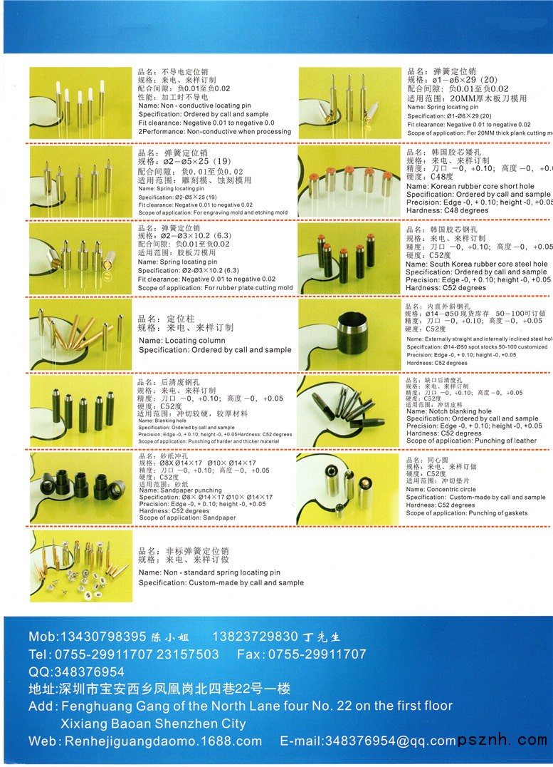 深圳市人和沖孔制品有限公司系高精度激光刀模配件-鋼孔 的專業(yè)廠家,于2006年創(chuàng)建于深圳,公司技術(shù)力量雄厚,擁有30多名優(yōu)秀的技術(shù)團(tuán)隊(duì)及員工隊(duì)伍。不斷采用國(guó)際最前端設(shè)備,如:日本津上、法蘭克數(shù)控車床、臺(tái)灣數(shù)控車床、高端磨刀機(jī)、高速電腦鑼、高精密磨床、銑床、自動(dòng)車床、自動(dòng)攻牙機(jī)等等。高精密檢測(cè)儀器,如:投影儀、高倍顯微鏡等,自開廠以來(lái)專業(yè)為廣大客戶攻克各種材質(zhì)高難度沖切問(wèn)題。本公司銷售團(tuán)隊(duì)宗旨:質(zhì)量第一、交期第一、服務(wù)第一,做中國(guó)最誠(chéng)信的鋼孔供應(yīng)商,以滿足廣大客戶的不同需求