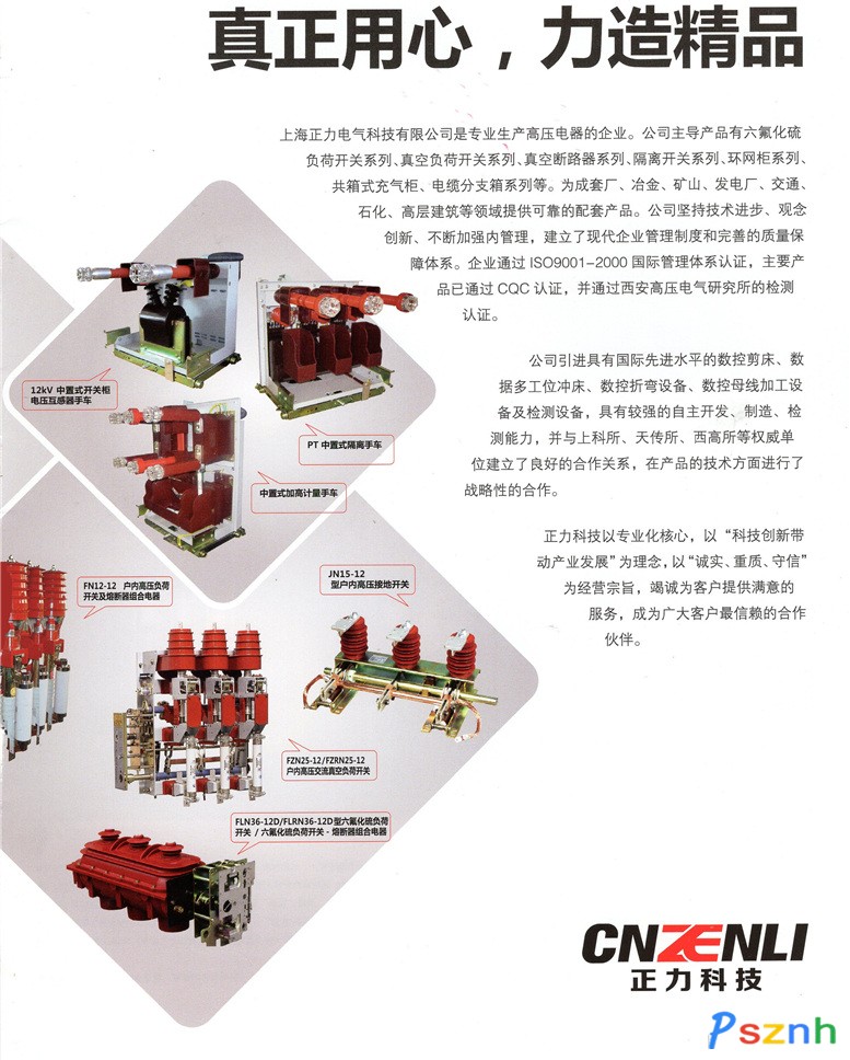 上海正力電氣科技有限公司是專業(yè)生產(chǎn)高壓電器的企業(yè)。公司主導(dǎo)產(chǎn)品有六氟化硫負(fù)荷開(kāi)關(guān)系列、真空負(fù)荷開(kāi)關(guān)系列、真空斷路器(高壓真空斷路器)系列、隔離開(kāi)關(guān)系列、環(huán)網(wǎng)柜系列、共箱式充氣柜、電纜分支箱系列、接地開(kāi)關(guān)系列、PT手車等產(chǎn)品。為成套廠、冶金、礦山、發(fā)電廠、交通、石化、高層建筑等領(lǐng)域提供可靠的配套產(chǎn)品。公司堅(jiān)持技術(shù)進(jìn)步、觀念創(chuàng)新、不斷加強(qiáng)內(nèi)管理,建立了現(xiàn)代企業(yè)管理制度和完善的質(zhì)量保障體系。企業(yè)通過(guò)ISO9001-2000國(guó)際管理體系認(rèn)證,主要產(chǎn)品已通過(guò)CQC認(rèn)證,并通過(guò)西安高壓電氣研究所的檢測(cè)認(rèn)證。