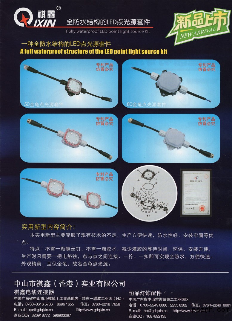公司又于2009年12月投巨資引進(jìn)一批LED管材生產(chǎn)設(shè)備,LED點(diǎn)光源生產(chǎn)設(shè)備,專業(yè)配套LED日光燈管和燈罩的生產(chǎn)與加工。并擁有一批技術(shù)過硬的專業(yè)人才.能按您提供的圖樣及要求 設(shè)計(jì)、生產(chǎn)出讓您滿意的產(chǎn)品.祺鑫電線連接器廠全體同仁將與您攜手共創(chuàng)美好明天!