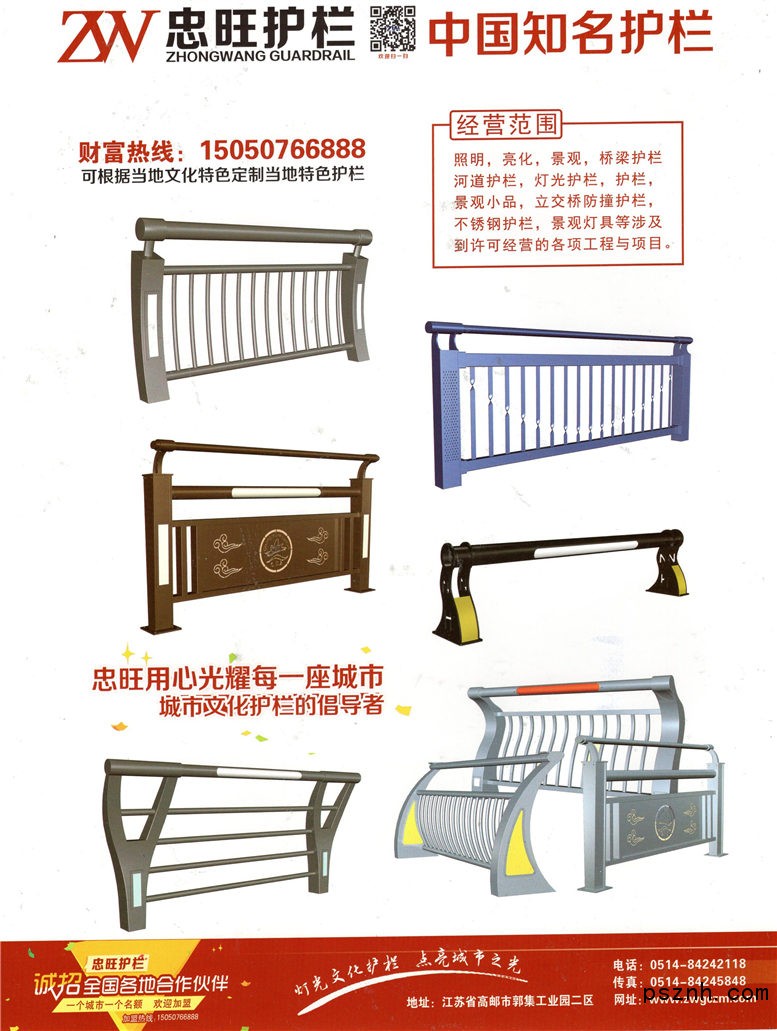揚(yáng)州市忠旺工程照明有限公司,是一家集產(chǎn)品研發(fā)、設(shè)計(jì)、生產(chǎn)、銷售及施工服務(wù)于一體的專業(yè)照明工程企業(yè)。主要業(yè)務(wù)方向包括燈光與護(hù)欄相結(jié)合的燈光護(hù)欄、橋梁燈光護(hù)欄、河道燈光護(hù)欄、景觀護(hù)欄、各種不銹鋼護(hù)欄、道路防撞護(hù)欄、指示牌等應(yīng)用領(lǐng)域。公司有專門的生產(chǎn)基地,位于江蘇高郵郭集工業(yè)區(qū),歡迎各位領(lǐng)導(dǎo),客戶參觀。
