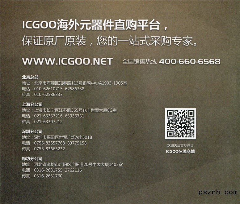 •   ICGOO的客戶群體覆蓋了所有可以應用電子元器件產(chǎn)品的用戶。您可以是大、中、小型的國內(nèi)貿(mào)易商,也可以是國個各個領(lǐng)域的生產(chǎn)型企業(yè),還可以是國內(nèi)各類科研機構(gòu)及高校實驗室。當然,如果你是熱衷于電子產(chǎn)品DIY的愛好者,同樣也能夠與ICGOO這一開放的平臺合作。您只需登陸我們的網(wǎng)站www.icgoo.net或者直接與我們的客服人員聯(lián)系,提出您的要求,我們都會在第一時間為您尋找適合您的產(chǎn)品。