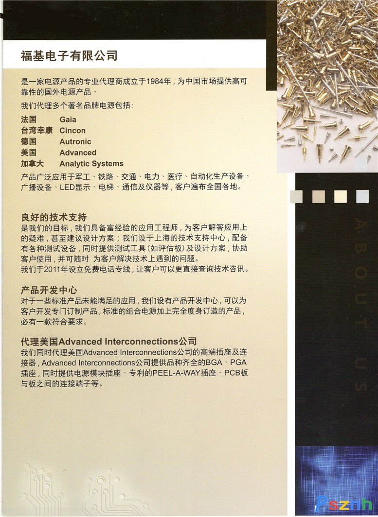 基電子有限公司是一家電源產(chǎn)品的專業(yè)代理商,成立于1984年,為中國市場提供高可靠性的國外電源產(chǎn)品。我們代理多個著名品牌電源,包括法國Gaia、日本Cosel、捷克Tesla、德國Autronic、臺灣Cincon、法國PST、及加拿大Analytic Systems等。產(chǎn)品廣泛應(yīng)用于軍工、鐵路、交通、電力、醫(yī)療、自動化生產(chǎn)設(shè)備、廣播設(shè)備、LED顯示、電梯、通信及儀器等,客戶遍布全國各地。 良好的技術(shù)支持,亦是我們的目標(biāo),我們具備富經(jīng)驗的應(yīng)用工程師,為客戶解答應(yīng)用上的疑難,甚至建議設(shè)計方案;我們設(shè)于上海的技術(shù)支持中心,配備有各種測試設(shè)備,同時提供測試工具(如評估板)及設(shè)計方案,協(xié)助客戶使用,并可隨時 為客戶解決技術(shù)上遇到的問題。我們并于2011年設(shè)立免費電話專線,讓客戶可以更直接查詢技術(shù)咨訊。
