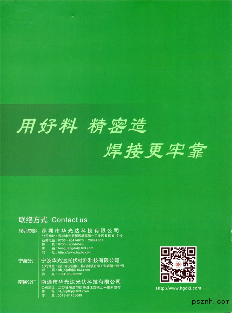 公司創(chuàng)始人魏光炎教授自1999年開始主持太陽能電池組件的工藝開發(fā)及生產(chǎn),在此積累了豐富的經(jīng)驗。2005年創(chuàng)立華光達公司以來,不斷改良工藝、開發(fā)新品,先后研制生產(chǎn)了含鉛(TM-A),環(huán)保型 (TM-B)、含鉛含銀(TM-C)光伏焊帶以及薄膜電池配套的超薄焊帶,各種規(guī)格型號產(chǎn)品多達300余種,年組件配套能力超過5GW。公司管理執(zhí)行ISO9001體系,生產(chǎn)的光伏焊帶 (也稱涂錫帶/涂錫銅帶/互連條/匯流帶)產(chǎn)品表面光亮、涂層均勻、可焊性好、導(dǎo)電性能高;環(huán)保型光伏焊帶已通過SGS檢測認證,符合歐盟RoHS標準.產(chǎn)品遠銷歐洲、東南亞等地。