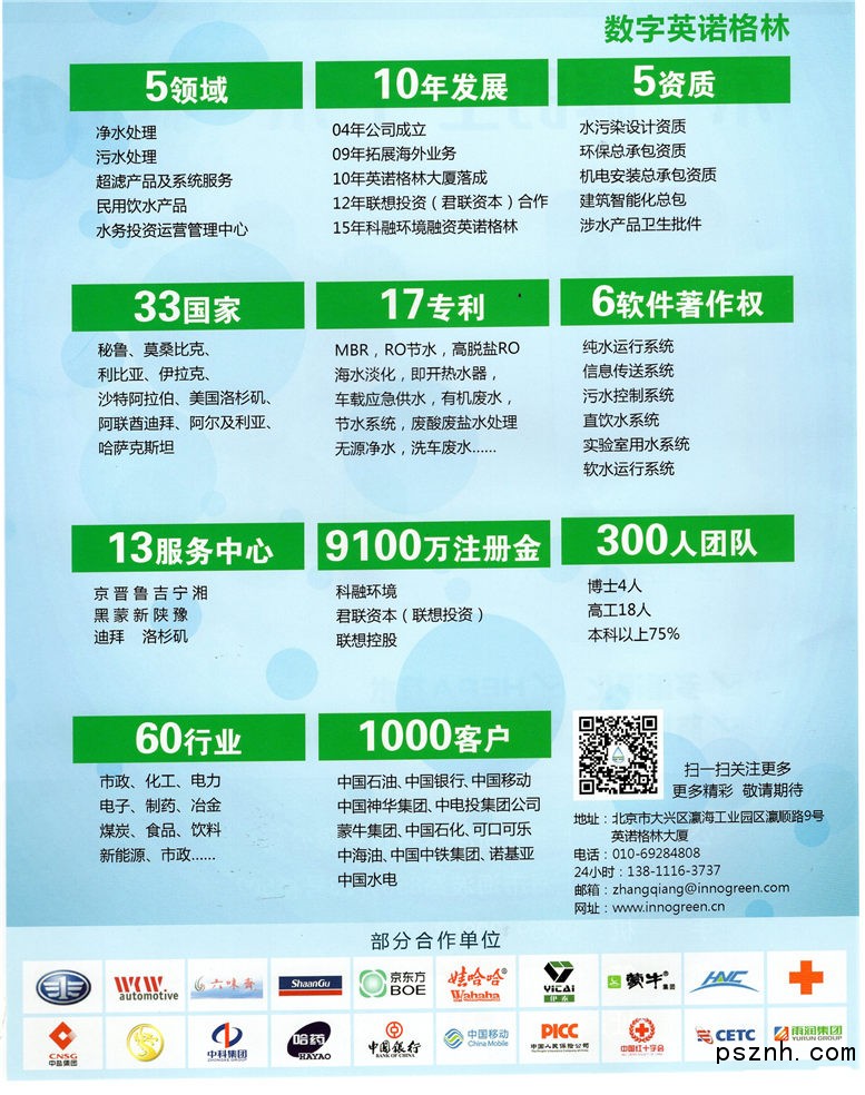 公司注冊(cè)資本9100萬(wàn)元,公司擁有17項(xiàng)水處理相關(guān)國(guó)家專(zhuān)利,300余名專(zhuān)業(yè)水處理人才,在北京15000平米現(xiàn)代化廠(chǎng)房和在徐州經(jīng)濟(jì)開(kāi)發(fā)區(qū)占地545畝生產(chǎn)基地,廠(chǎng)房面積67000㎡。英諾格林在市政、化工、電力、電子、制藥、冶金、煤炭、食品飲料、中水回用、垃圾滲濾液、海水淡化等不同領(lǐng)域水處理技術(shù)上均取得了重大突破,并服務(wù)了眾多知名客戶(hù)。在膜材料制備、膜組件制造和膜系統(tǒng)應(yīng)用方面,英諾格林整合國(guó)內(nèi)一流專(zhuān)家、技術(shù)和設(shè)備,相關(guān)膜產(chǎn)品已經(jīng)達(dá)到國(guó)內(nèi)領(lǐng)先國(guó)際先進(jìn)的水平。公司獨(dú)創(chuàng)的IMWS(innogreen modular watertreatment system英諾格林模塊化水處理系統(tǒng))技術(shù),掀起了水處理領(lǐng)域的革命,通過(guò)眾多項(xiàng)目積累的模塊化設(shè)備的經(jīng)驗(yàn),確保了每個(gè)系統(tǒng)的可靠性、穩(wěn)定性和易用性,引領(lǐng)了未來(lái)水處理行業(yè)的發(fā)展。
