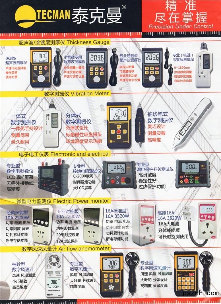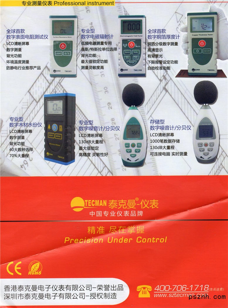 泰克曼電子儀器(香港)控股有限公司深圳市泰克曼電子有限公司公司簡介: 香港泰克曼電子儀器控股有限公司(TECMAN ELECTRonIC INSTRUMENT HOLDINGS LIMITED)專業(yè)研發(fā)及制造TECMAN(泰克曼)品牌系列各類專業(yè)儀器儀表,公司產(chǎn)品包含:便攜式非接觸紅外測溫儀、數(shù)字式測振儀、超聲波測厚儀、涂層測厚儀、數(shù)字風(fēng)速風(fēng)量計、數(shù)字噪音計、數(shù)字式溫濕度計、人體測溫儀等專業(yè)儀表;對國內(nèi)外行業(yè)特殊需求客戶提供OEM及ODM相關(guān)服務(wù)。 本公司秉持:品質(zhì)創(chuàng)造價值;科技 服務(wù)于人的企業(yè)發(fā)展理念,堅持不懈的為國內(nèi)外客戶提供性能穩(wěn)定,品質(zhì)優(yōu)良的產(chǎn)品。 TECMAN品牌在國內(nèi)外市場的建設(shè)和推廣是本公司堅定不移的目標(biāo),為客戶提供品質(zhì)優(yōu)良的產(chǎn)品和快捷無憂的售后服務(wù)是本公司信守的諾言。 本公司熱忱歡迎國內(nèi)外有實力的客戶共同開發(fā),協(xié)作發(fā)展,開創(chuàng)TECMAN美好的未來。 香港泰克曼電子儀器控股有限公司 TECMAN ELECTRonIC INSTRUMENT HOLDINGS LIMITED