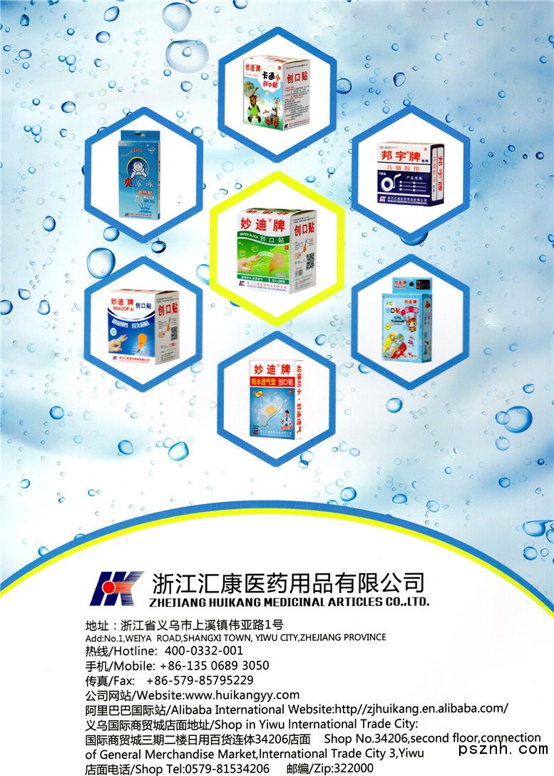 浙江匯康醫(yī)藥用品有限公司成立于2002年,為浙江省醫(yī)療器械行業(yè)協(xié)會理事、金華市醫(yī)療器械協(xié)會副會長、義烏市藥學會常務(wù)理事單位。主要生產(chǎn)“急救包”、“創(chuàng)可貼”、“退熱貼”、“醫(yī)用膠帶”等醫(yī)療器械衛(wèi)生材料及敷料產(chǎn)品。公司注冊資金550萬元,擁有自行進出口權(quán),現(xiàn)有凈化車間500多平方米,創(chuàng)口貼生產(chǎn)線14條,退熱貼生產(chǎn)線3條,急救包生產(chǎn)線2條,擁有多臺(套)創(chuàng)口貼、醫(yī)用膠帶、退熱貼自動專用設(shè)備和EO滅菌設(shè)備及相關(guān)的檢驗檢測設(shè)備。 公司已通過ISO13485:2003和CE、FDA質(zhì)量管理體系認證,堅持“以質(zhì)量求生存、以誠信求發(fā)展”是本公司的宗旨。良好的品質(zhì),優(yōu)越的價格使得匯康的產(chǎn)品得到了國內(nèi)經(jīng)銷商的喜愛之外,同時還遠銷歐洲、美洲、非洲、亞洲,深受海外客戶的青睞。本公司竭誠歡迎國內(nèi)外新老客戶與我們攜手合作,共同發(fā)展。